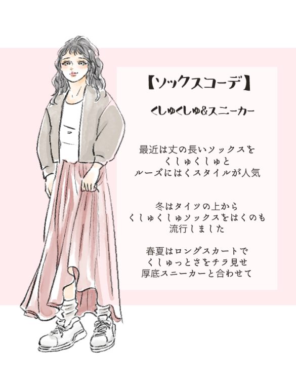 昨今、靴下のトレンドは丈が少し長めのものになっています。以前はアンクル丈のソックスで、靴下を見せないか見せても本当に一部分だけというのが主流でした。しかし、数年前からだんだんと靴下丈はハイソックスに切り替わっていき、現在は長めの丈をくしゅくしゅと弛(たる)ませたルーズ感のあるようなコーディネートが人気です。Y2Kブームでルーズソックス自体が返り咲いたことも影響していますね。