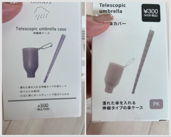 今回は、3COINSの「伸縮傘ケース」(税込330円)とダイソーの「伸縮傘カバー」(税込330円)を比較します!