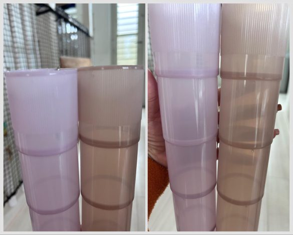 透明具合ですが、光りにかざすと向こう側から手が透けて見えるくらい。キャンドゥのピンクのほうが透けて見えます。