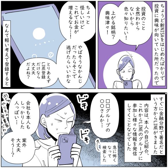 本記事では1~3話を紹介。記事後半からはペぷりさんに、投資を始めたきっかけや、詐欺グループを信用してしまった経緯などについて聞きました。