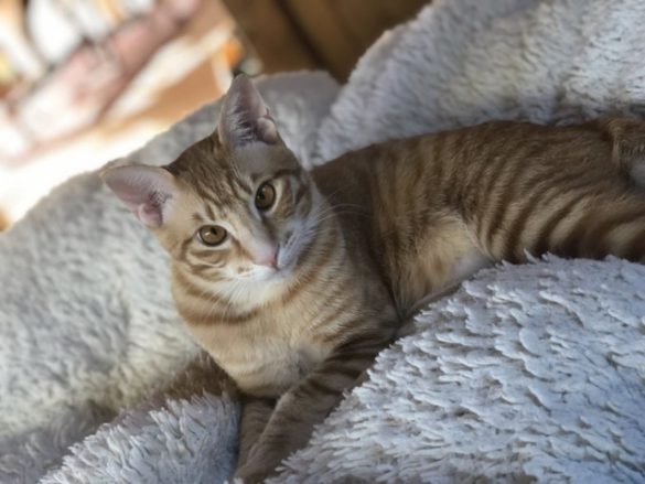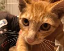 旦那さんが連れ帰ってきたのは、やせ細った生後3ヶ月ほどの子猫。耳ダニやノミがおり、猫風邪も患っていたようで鼻水が見られ、しゃがれ声でした。