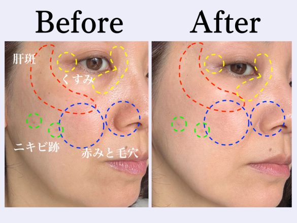 筆者の肌悩みは、頑固な目の下のクマ、頬に広がる肝斑と毛穴です。それらをどこまでカバーできるのか使ってみた結果は……。