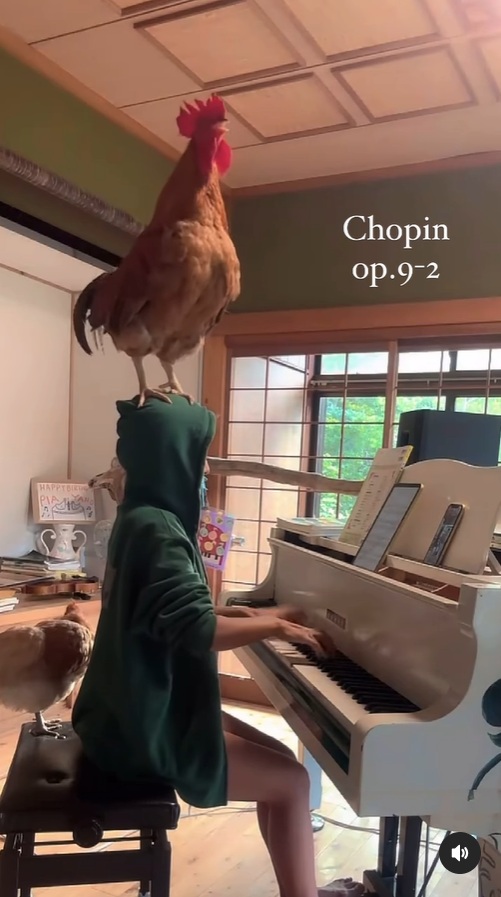 ぴあやの:もともと、にわとりとは常に一緒にいたんです。足元にずっと座っているか、ピアノを弾くと肩や頭によく乗ってくるので、それがきっかけです。私が練習してると、勝手にやってきちゃう。