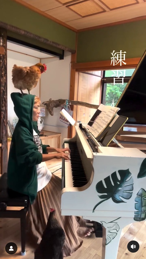 『ブレーメンの音楽隊』を思い出してしまいました。鹿児島県の離島・喜界島に移住したピアニスト・ぴあやのさん(@piayano2017)がInstagramに投稿しているのは、頭の上ににわとりを乗せた状態でピアノを弾き続ける演奏動画。