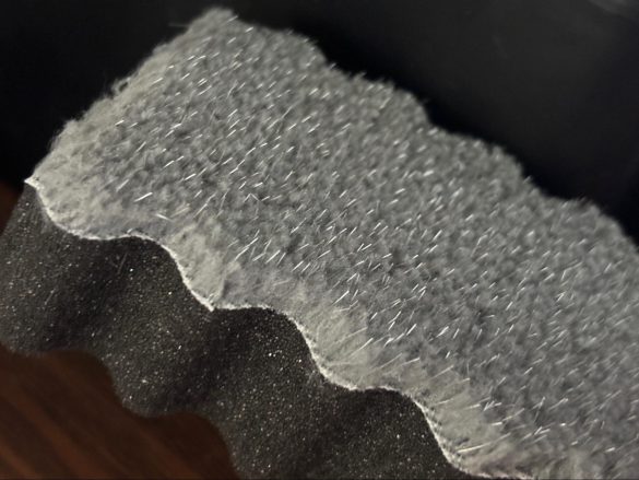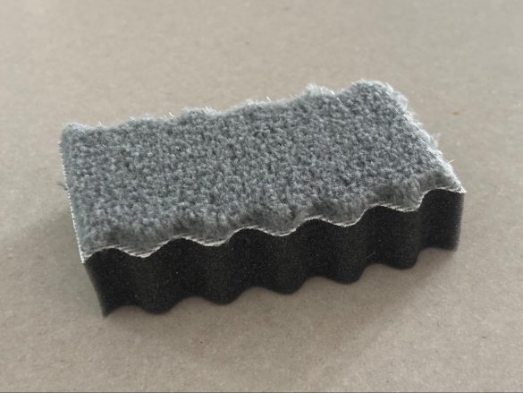 一見よくあるスポンジのようですが、毛足の長いマイクロファイバーと、ブラシ繊維が組み合わさったスポンジになっていて、クッション性のあるスポンジは細やかな隙間や曲面にフィットします。握りやすい波型形状も使いやすいポイントの一つですね。