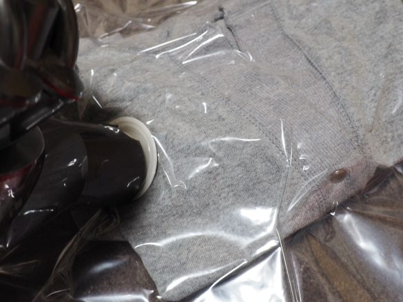 30秒ほどで徐々に空気が抜けてきます。衣類に袋がペターッと貼りついてくる様子は、見ていて気持ちがいいですよね。そのまま吸引を続けること、1分弱ーー。