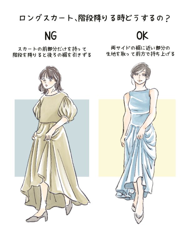 よくある光景としては、スカートの前部分の裾を片手で持って上り下りをしているケース。実はこれだと後ろのスカートを引きずってしまっている可能性があります。かといって、スカート全周の裾をたくし上げると脚が思い切り露出してしまいますし、なんだか上品には見えませんよね。