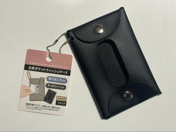 「大きめサイズのティッシュが入るものもあればいいのに……」という声も聞こえてきそうですが、キッズサイズのティッシュケース以外にも、同じくキャンドゥで「合皮ポケットティッシュケース」110円(税込)が売られていました。カラーはベージュとブラックの2色展開で、高級感あるシンプルなデザイン。バッグにつけても違和感がないのが嬉しいですよね!