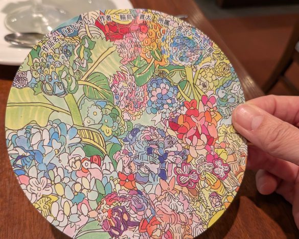 「Fresh Melon Dessert」で使用するコースターには、「金沢アート工房」のアーティストである輪島 貫太氏のデザイン「あじさい」が採用されている