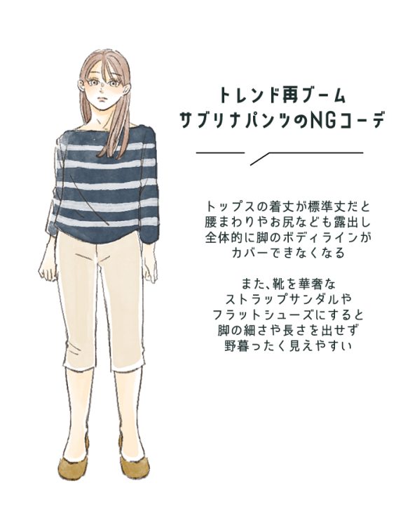 というのも、サブリナパンツは膝の関節もしくは、ふくらはぎの一番太い部分が露出されるハンパ丈なので、脚が太く見えやすいのです。