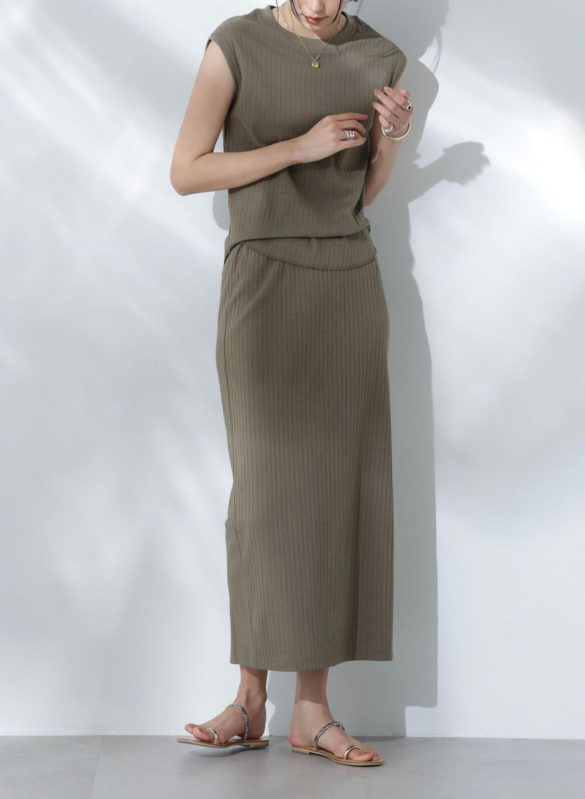 ナノ・ユニバースのAnti Soaked®、ノースリーブTシャツ(5280円税込)とリブタイトスカート(8800円税込)