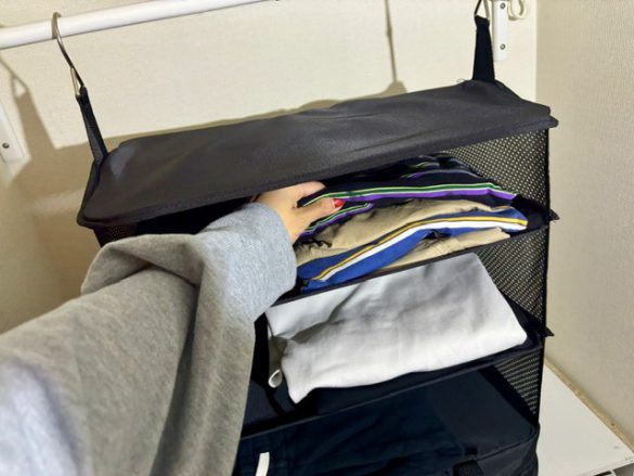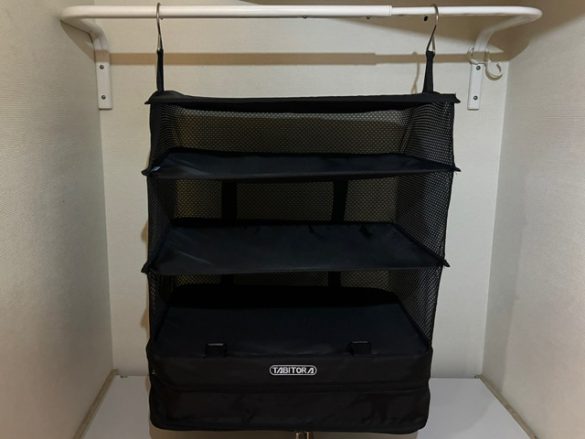 今まではジッパー付きのバッグなどに小分けにしていれていましたが、物を取り出すごとにトランクの中がぐちゃぐちゃになっていたので、“取り出して吊るすだけ”は本当にラクですよ。