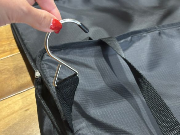 ファスナーをグルっとあけると、吊り下げ用のフックがでてきます。旅行前の荷造りや旅先のホテルで使用する際にはハンガーレールに吊り下げた状態で使用できるので、荷物の整理がしやすいのが大きなポイントです◎!