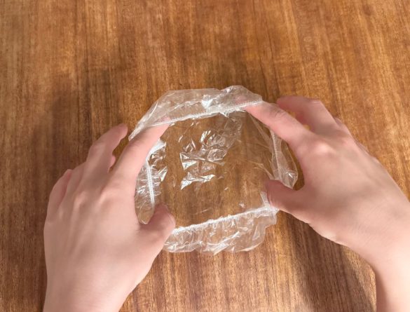 見た目は完全にミニシャワーキャップ。ポリエチレン製の透明なフィルムのふちに伸縮ゴムが入っていて、食器にかぶせた時にぴったりとフィットするようになっています。