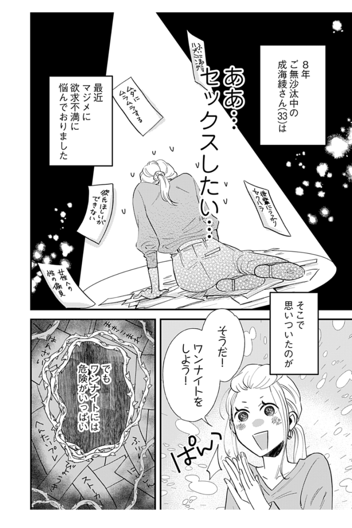 現在、コミックシーモアで連載中の『マイ・ワンナイト・ルール』(著:なかおもとこ/シーモアコミックス))の主人公・成海綾は、外資系の旅行会社で働く33歳独身女性。ある時期から突然暴れ出した性欲を鎮めるため、自分だけの“ワンナイト・ルール”を定めてお相手探しに奔走する――。