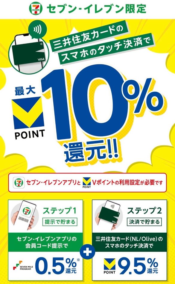 特にセブン-イレブンでの利用がおすすめです。対象店舗の中でもセブン-イレブンのみ3%が上乗せされて、最大10%還元となります(スマホのタッチ決済で9.5%、セブン-イレブンアプリのバーコード提示で0.5%の合計10%還元)。