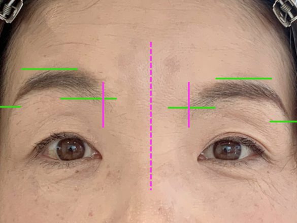 眉の一番高いところと低いところに線を引いて、左右のズレ具合を確認します。ぜひ自撮りをして、写真をコンビニなどでプリントして、ご自身で墨出しをしてみてください。意外と眉がズレていてびっくりするかも……。