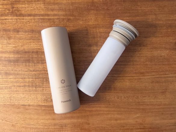 筆者が購入したのは、ピーコック魔法瓶の「ミニアイスパック シリコーン氷のうタイプ ABB-16」。同社のシリコーン氷のう全3種のうち中間のサイズです。本体は直径が約5.8cm、高さが17cmで、小さめの水筒のような見た目&サイズ感です。