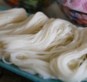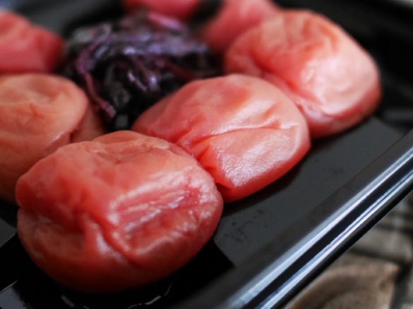 ①梅干しを加えてゆでる⇒べちゃべちゃにならないコシのある麺に