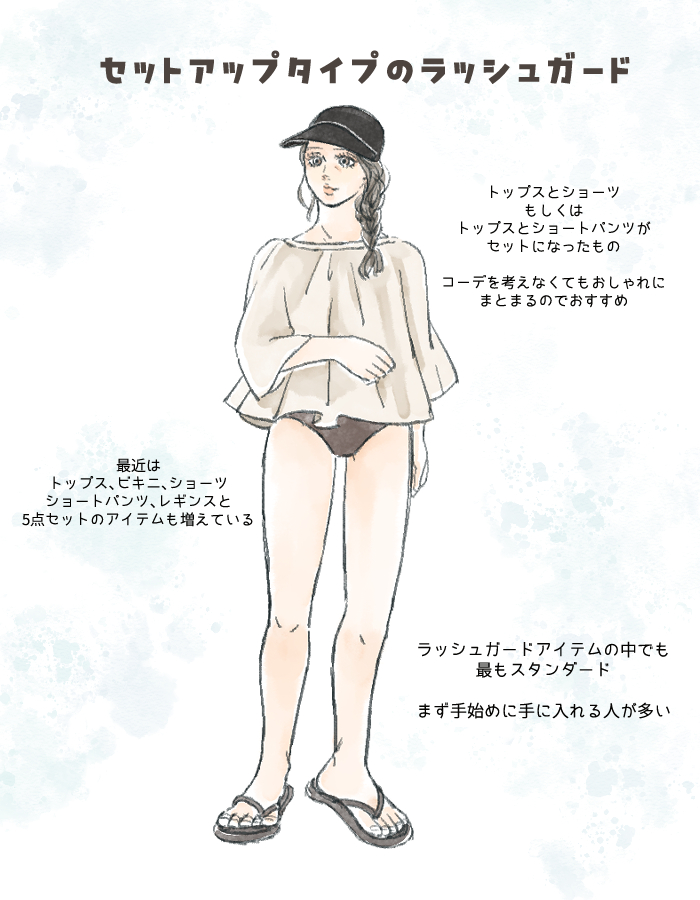 レギンスなど他アイテムとのコーディネートも楽しめますが、スタイリングに自信がない方は、3点または5点セットのラッシュガードを選ぶのもおすすめです。