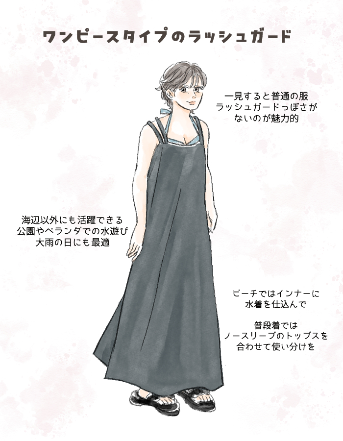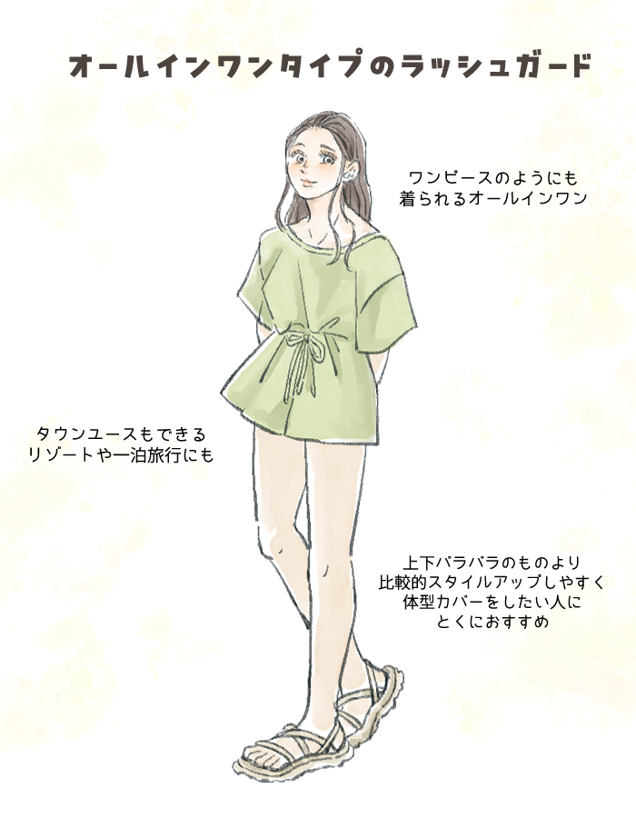 コーディネートが一枚で完成するのは、オールインワンタイプのラッシュガード。