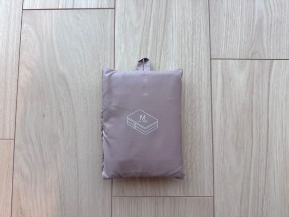 あとは折り畳んだ部分を下からくるくると3回折って袋の中へ入れるだけ。エコバッグにもよくある畳み方で、簡単かつきれいに収まります。