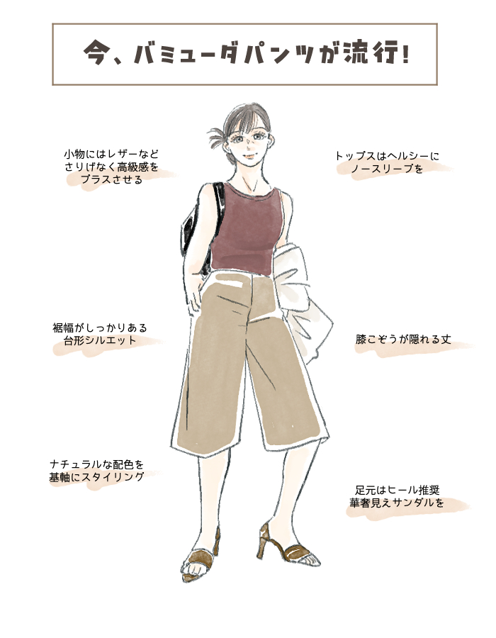 みなさん、こんにちは。ファッションスタイリスト&ライターの角 佑宇子(すみ ゆうこ)です。昨今のファッショントレンドではミニ丈のトップスやボトムスが流行中。長きにわたるロング丈に取って代わる勢いで、さまざまな丈のパンツやスカートが登場していますがそのなかでもとくに2025年を象徴するアイテムといえば、「バミューダパンツ」。今回は、40代のバミューダパンツの着こなし方についてご紹介いたします。
