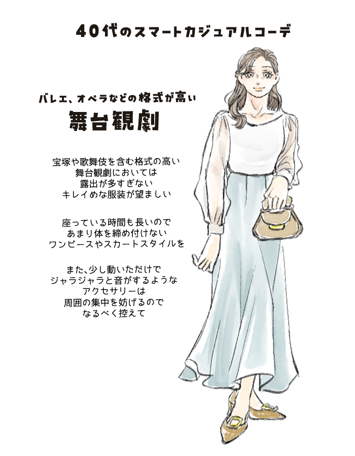 歌舞伎やクラシックコンサート、バレエやお能といった格式の高い舞台観劇においては、スマートカジュアルが望ましいです。フォーマルのようにノースリーブがNGという縛りはありませんが、静かに鑑賞するため動くたびにジャラジャラと音を立てる装飾品は避けましょう。室内では体温調節もしやすいようにジャケットもしくは薄手の長袖だと良いですね。