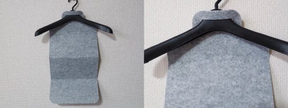 「消臭機能付き くりかえし使える除湿シート ハンガー用」上部の穴を、ハンガーの本体に通せばセット完了。