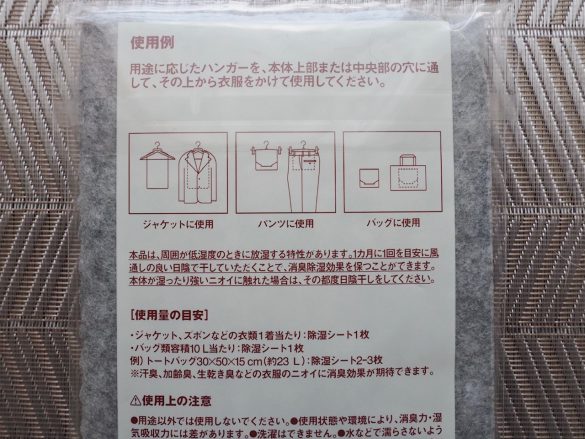 使用量の目安はジャケット、ズボンなどの衣類1着あたり:除湿シート1枚、バッグ類容積10Lあたり:除湿シート1枚です。