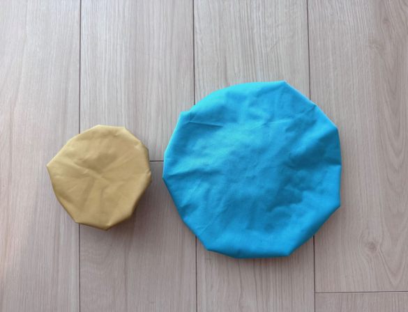 昔から持っている氷のうは直径約20cm。対してSeriaのバイカラー氷のうは約12cmほど。コンパクトサイズで、子どもが部活や習い事に持って行く小さなクーラーボックスや保冷バッグに入れてもスペースを取りません。