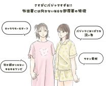 鉄板NGはいかにもなパジャマ感が強いアイテム。ツルツルなサテン素材のパジャマはもちろんですが、キャラクターが描かれたTシャツ&ショートパンツのセットアップもパジャマ感が拭えないので避けておいたほうが良さそうですね。