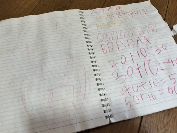 英語のノートなのに、途中から数式書いているありさま。どういうつもりだったのやら、子育てにおける母の苦労がしのばれます。