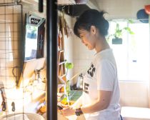 そんなShihoさんが、家の中で一番気に入っているのがキッチンです。料理をしたり、洗い物をしたり、「そこで過ごしているだけで、何となく落ち着く」と話します。もとは白いキッチンでしたが、自分で赤く塗り直しました。
