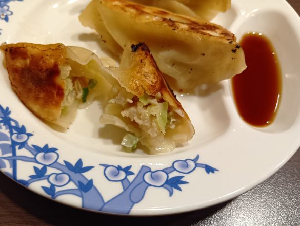 「本格焼餃子」は餡がギッシリというわけではない。ただ、ニンニクが効き、ジューシーさもある。良い意味で特に言うことのない安定感のある味だ。卓上にいろいろ調味料が置いてあるため、醤油や酢コショウなど、自分の好きな味で食べられる。