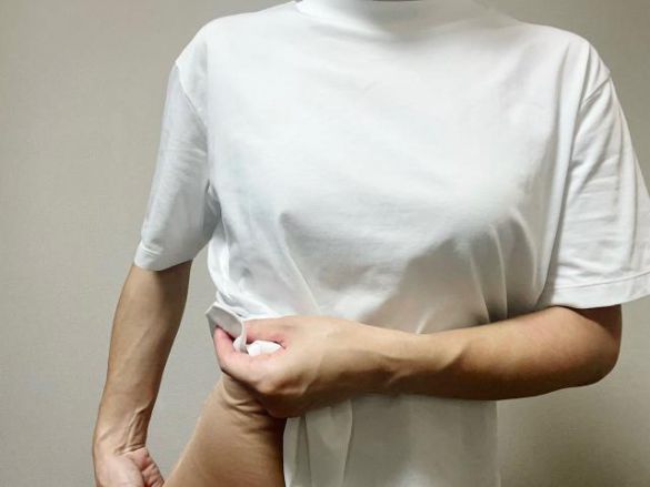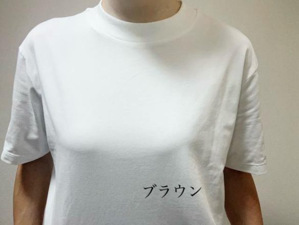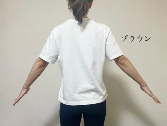 夏が終わり、薄っすら日焼けをしている筆者の肌には、ブラウンが1番近かった――ということですね。影っぽく見えて、肌と白Tのあいだで自然に溶け込んでいるのがわかります。