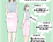 最後は、下腹部から膝にかけて脚の太さや幅感が目立つシルエット。たとえばフィット感の強いタイトスカートは、下腹部のぽっこりはそのままに、脚に向かうにつれて細くなるので余計に下腹部が目立ちます。正面から見た時に樽のように丸みのあるシルエットになっている場合は、下腹部というよりは下半身全体が太って見えるので気をつけましょう。