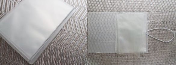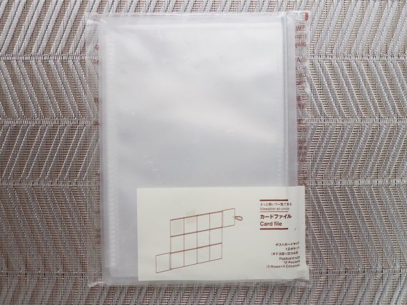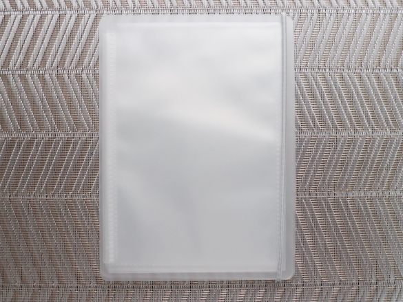 表紙は半透明でザラザラ、プラスチックの一種・ポリプロピレン製でやや硬め。筆者が購入した12ポケットタイプは、ポストカード(148×100mm)を入れることができるやや大きめサイズです。