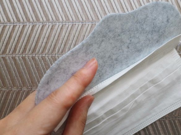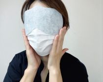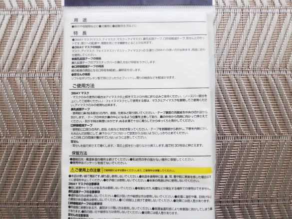 アイマスクの下のほうと、不織布マスクの上のほうが接着されて、ピタッとくっ付いているんですね。不織布マスクのプリーツのヒダ部分にちょうどいい折り目がついていて、裏表でアイマスク、マスクとしての使い方が可能らしいです。