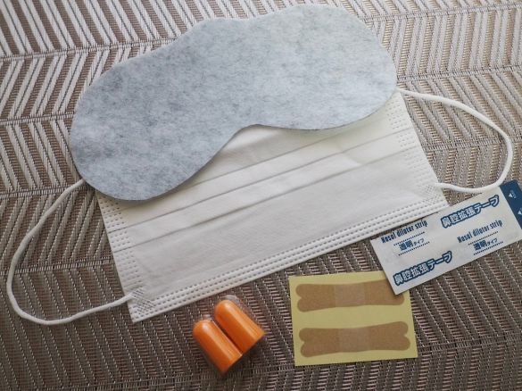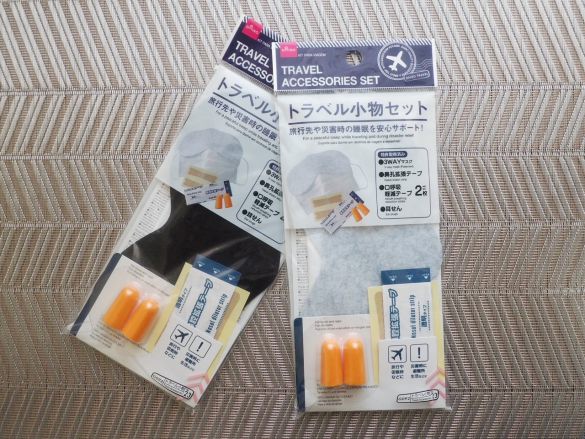 移動中に仮眠する時や、旅行・出張先のホテルなど環境が変わった時の眠りをサポートしてくれる3WAYマスク(アイマスク・フェイスマスクとしても使える)、耳栓、鼻腔拡張テープ、口呼吸軽減テープがセットになったのが、ダイソーの「トラベル小物セット」。