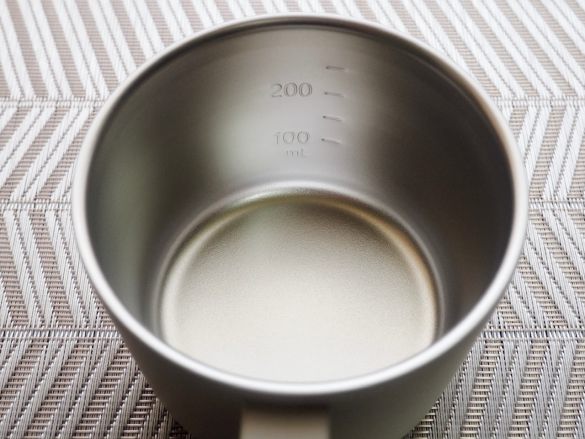 マグカップの内側には100ml、150ml、200ml、250mlの目盛り付き。即席スープや粉末飲料を作る時、計量カップでお湯を量る必要がないからとっても楽&便利です。