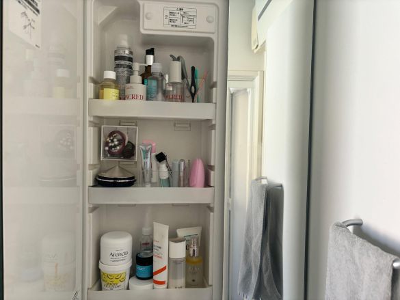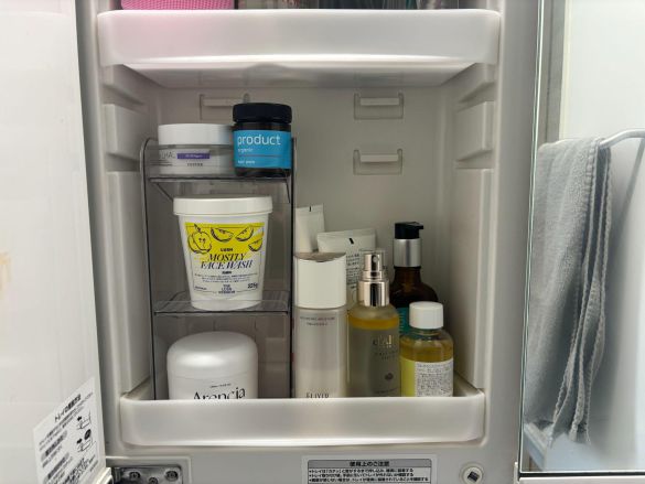 可動棚付きの標準仕様の洗面台の場合、鏡の裏の収納は奥行きが狭く、どうしてもデッドスペースが生まれがちです。スキンケアアイテムの形状もさまざまで、重ねたり隙間に埋め込んだりとテトリスのように詰め込むことでどんどん使いづらくなってしまいます。
