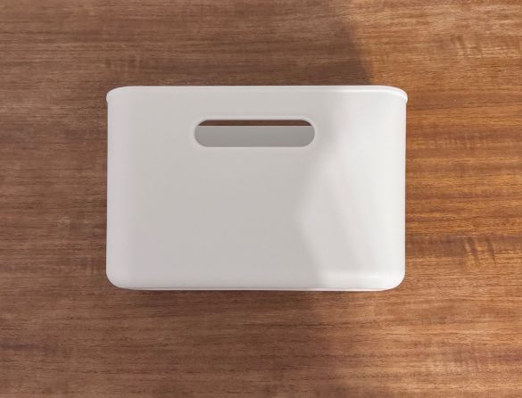 「吊るしても使える 薄型収納ケース」は、一見なんの変哲もないポリプロピレン製のケース。目新しいデザインというわけでもなく、「こんな感じのアイテム、昔からなかったっけ?」と危うくスルーしてしまうところでした。