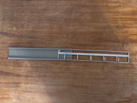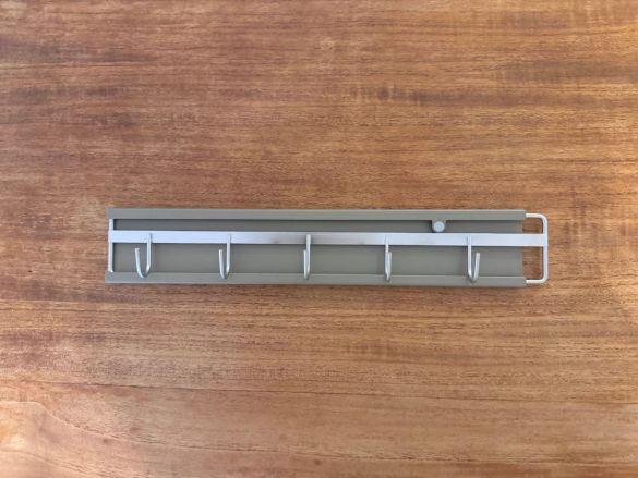 800円商品だけあって、鉄製のかなり重厚感のある作り。約高さ6.2×幅35~60×奥行き4cmで、5つのフック付き。耐荷重は1kg(フック1つあたり200g)です。