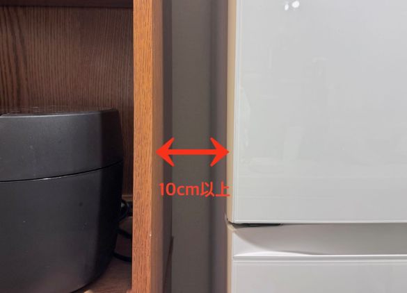 取り付けるには冷蔵庫の奥行きが約35cm以上、さらに冷蔵庫と家具などの隙間が10cm程度必要です。