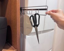 キッチン台に置いているトースターラックのサイド部分にかけていたアイテム達をマグネットスライドフックへと移動。トースターラックはリビングからも見える位置にあり、ハサミなどのこまごましたものをかけていることで見た目的にゴチャゴチャしてしまっていたのですが、マグネットスライドフックを設置した冷蔵庫側面はリビングからは見えない場所なので、隠しつつも収納できてキッチンがすっきりしました。