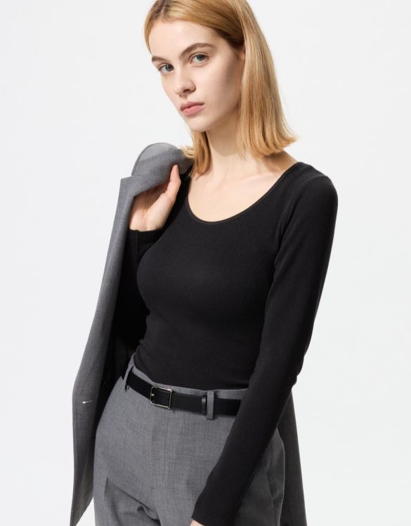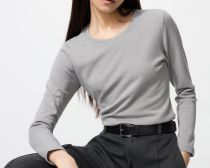 昨年からヒートテックブラTシャツが、極暖の素材で販売されるようになりました。極暖のヒートテックブラTの良さとは? 極暖ヒートテックリブUネックブラTシャツ/長袖商品名:極暖ヒートテックリブUネックブラTシャツ/長袖 商品番号:478793 価格:税込2,990円 「極暖のブラTになったことで、インナーとしてだけではなく、1枚でも着られるようになりました。首元もデコルテラインが綺麗に見える襟ぐりですし、リブ編みでできているのでこちらもカットソーとして着られます。  シルエットはスリムフィットなので、インナーとして使っていただいても着膨れしないでしょう。お好きな用途で使っていただけますよ」  筆者も試着してみました。首元はかなり開いていたので、好みによっては1枚よりインナーとして使う方が着やすいかもしれません。ほどよい厚さで、Tシャツの下に着てもすっきりと見えます。リブ素材なので、丈が短めのトップスとのレイヤードにはいいかもしれません。