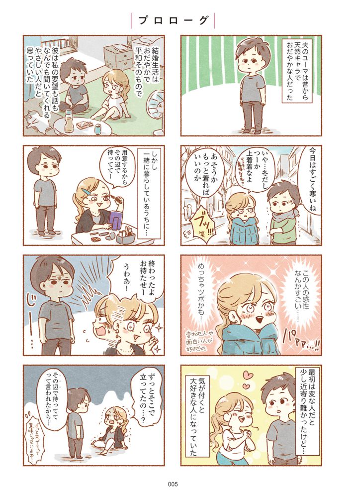 <私の要望も話もなんでも聞いてくれるやさしい人>(< >は同書より引用。以下同)。元ギャルで明るい性格の主人公のアコは、夫のユーマをそのように評し、平和な結婚生活をおくっていました。無口で天然キャラなユーマの性格を、アコ自身も最初はおもしろがっていたのです。しかし少しずつ、アコの心に違和感が芽生えます。