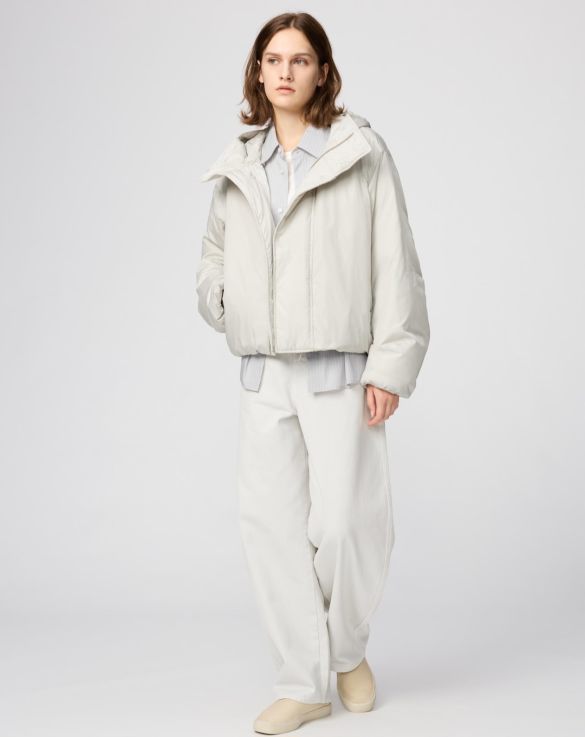 光沢感があり、横幅はゆったりしながらも着膨れせずすっきりしたシルエットをキープしている洗練されたアウターです。