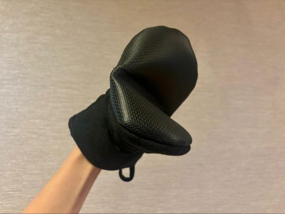 もっともスタンダードなタイプでいうと、親指部分が分かれている、手全体を包み込むような形状でしょうか。筆者の家ではこちらのタイプを使用していたこともあります。実際に使用していて着脱はしやすいものの、手が小さい子どもには大きすぎて使いづらく、子どもたちが自身でレンジ調理することが増えた今、悩みが浮き彫りになってきました。